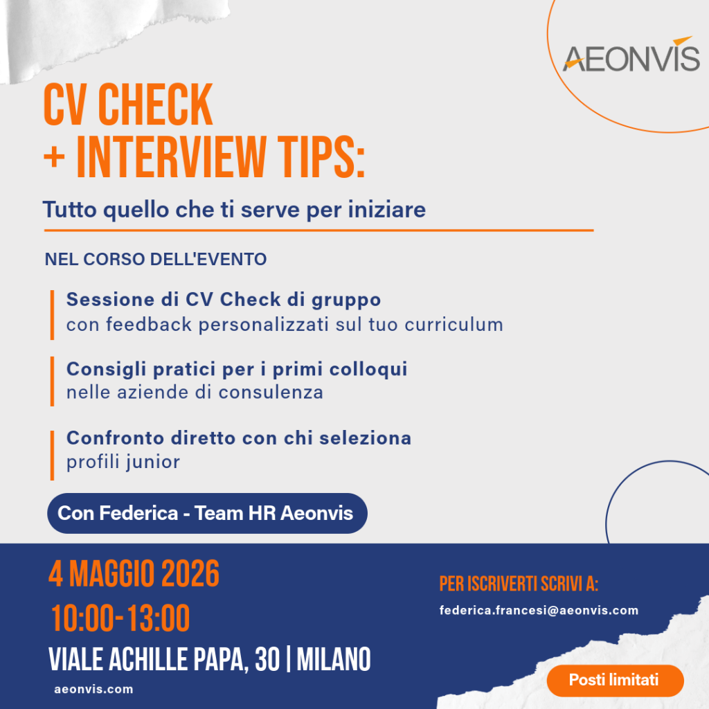 Il team Aeonvis apre per la prima volta le porte all’evento CV Check di gruppo con possibilità di farti conoscere e avviare l’iter di selezione. Per partecipare scrivi a: federica.francesi@aeonvis.com